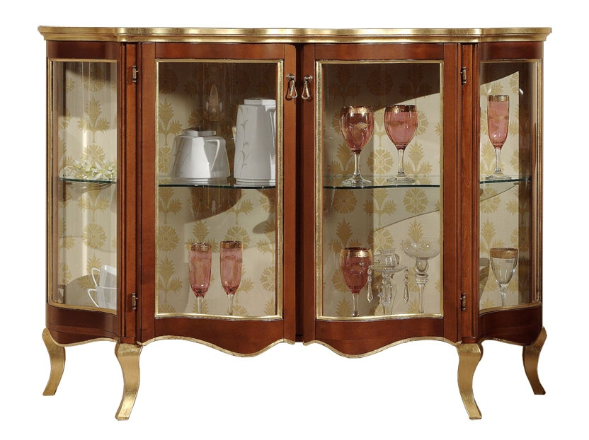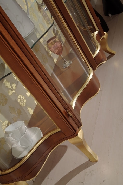 La sinuosa silhouette di questo mobile rende particolarmente apprezzabili i dettagli in foglia oro che caratterizzano i profili della struttura. I vetri seguono perfettamente la curvatura delle ante e dei fianchi. Internamente, lo schienale finemente tappezzato fa da sfondo al ripiano in cristallo che ottimizza lo spazio interno.
