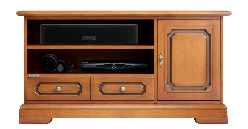 L'utilità data dal grande cassetto a doppia facciata, poi, risulterà preziosa per tutti gli accessori tipici del proprio spazio Tv.