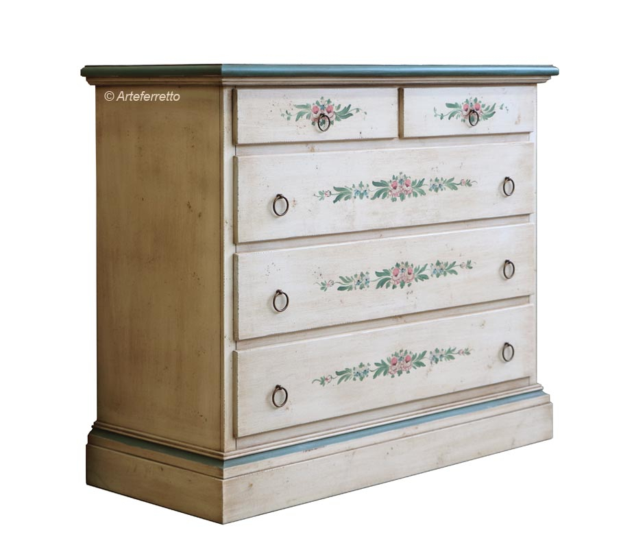 Comò 5 cassetti in legno massello di pioppo e toulipier con finitura laccata anticata e decoro floreale sulla parte centrale di ogni cassetto.