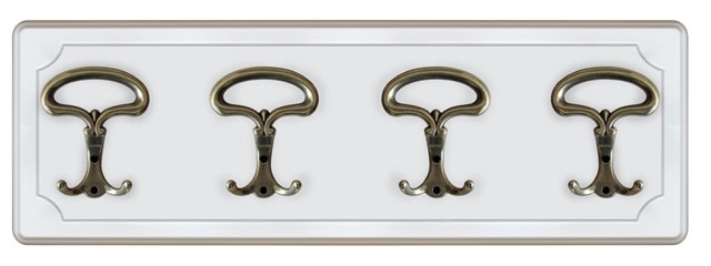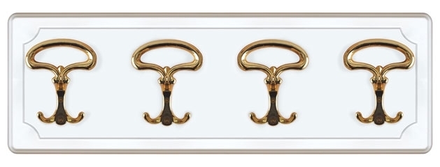 Pannello appendiabiti laccato bianco e appendini stilizzati con finitura bronzata.