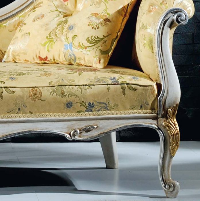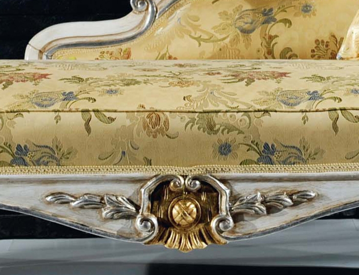 Legno sinuosamente lavorato, particolari intagliati e rifiniti in foglia oro, tessuto sopraffino, lavorazione meticolosamente accurata...