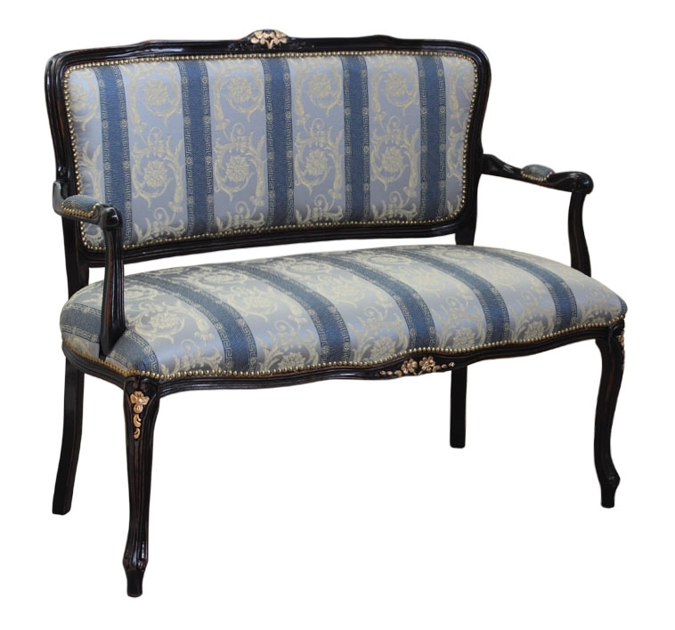 Delizioso divanetto dalla struttura affascinante. La bella laccatura nera lascia affiorare indizi di ciliegio e offre, nella parte impreziosita dall'intaglio, una bella finitura dorata.