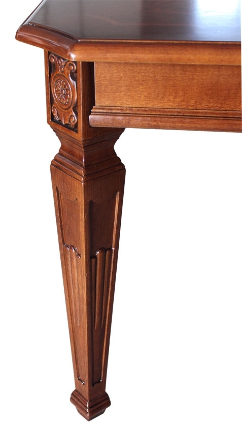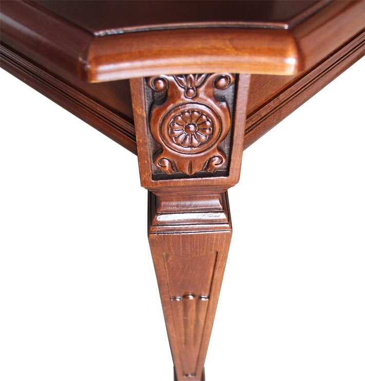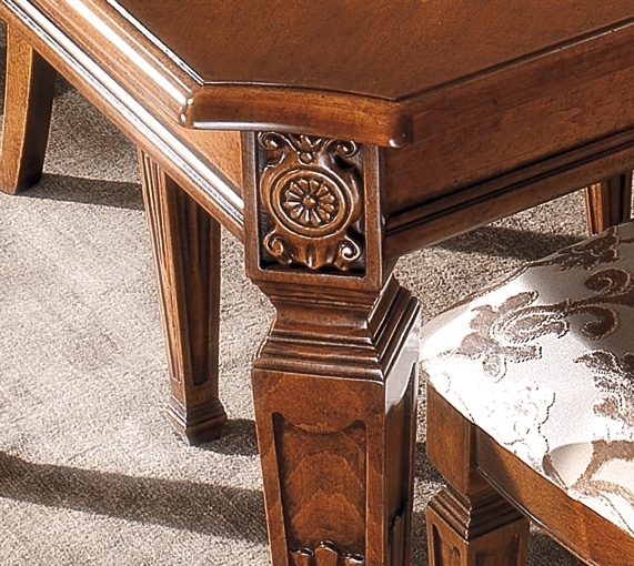 Il piano del tavolo è in MDF placcato noce con cornice in legno massello di toulipier. L'intarsio è ottenuto da essenze di acero e ciliegio. Il basamento è in legno massello di toulipier e gli intagli sono rigorosamente effettuati a mano.