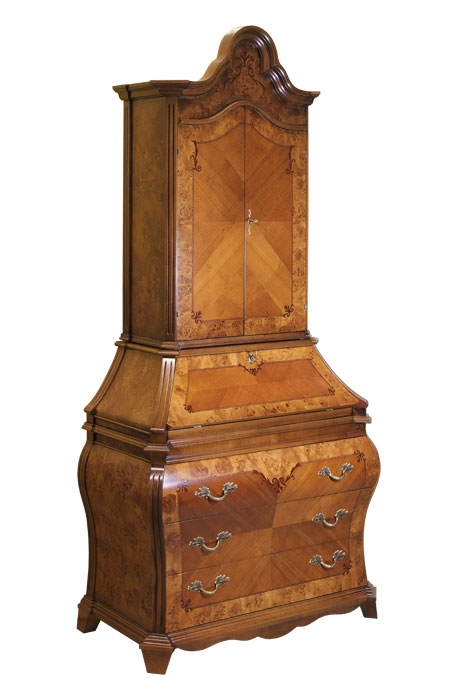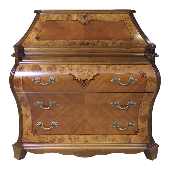 La struttura bombata è esaltata da preziosi intarsi circondati da fine radica dalla bellissima trama.