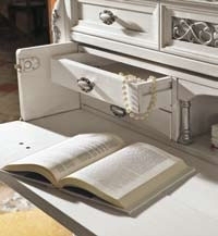 Laccato anticato, inserti in foglia argento, finitura antingiallente.