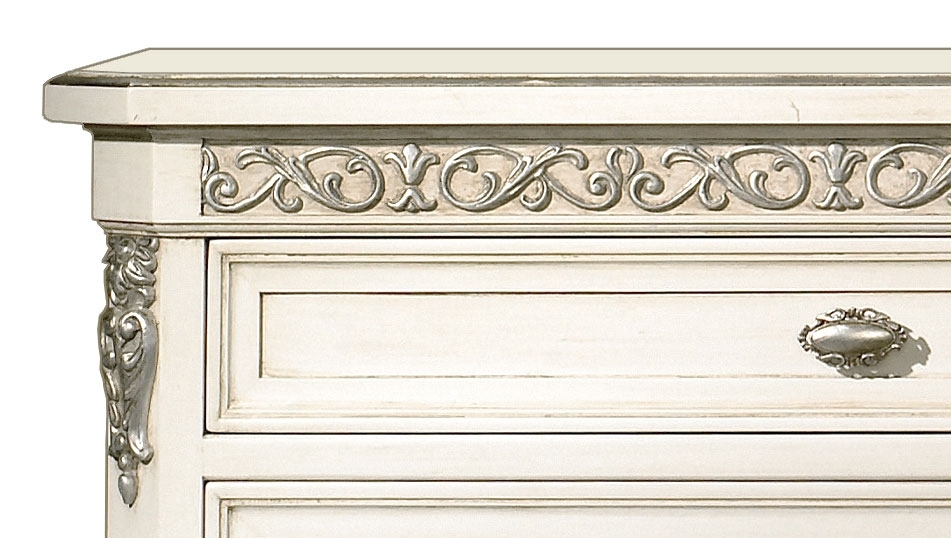 Laccato anticato, inserti in foglia argento, finitura antingiallente.