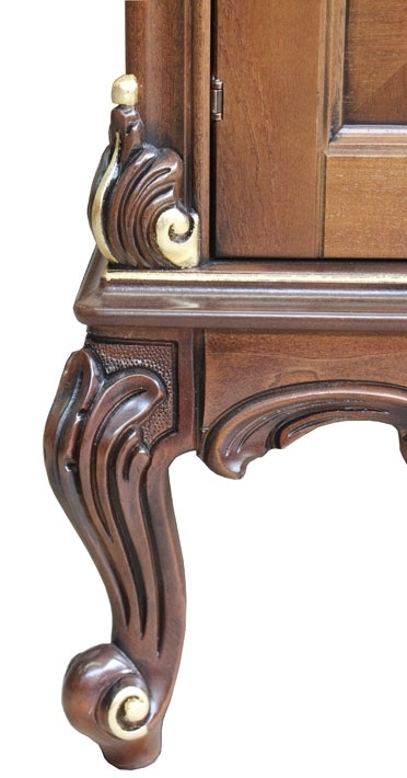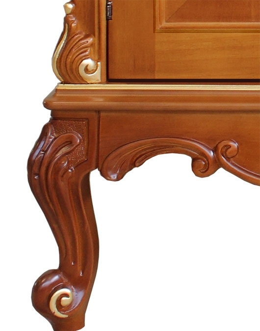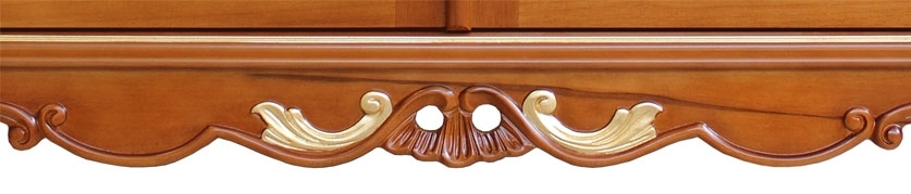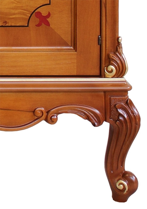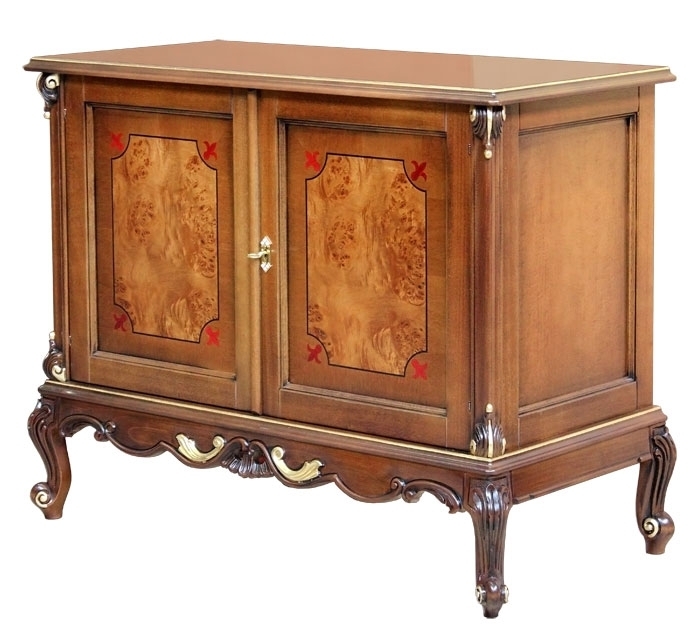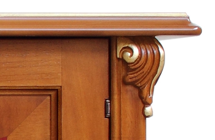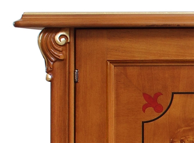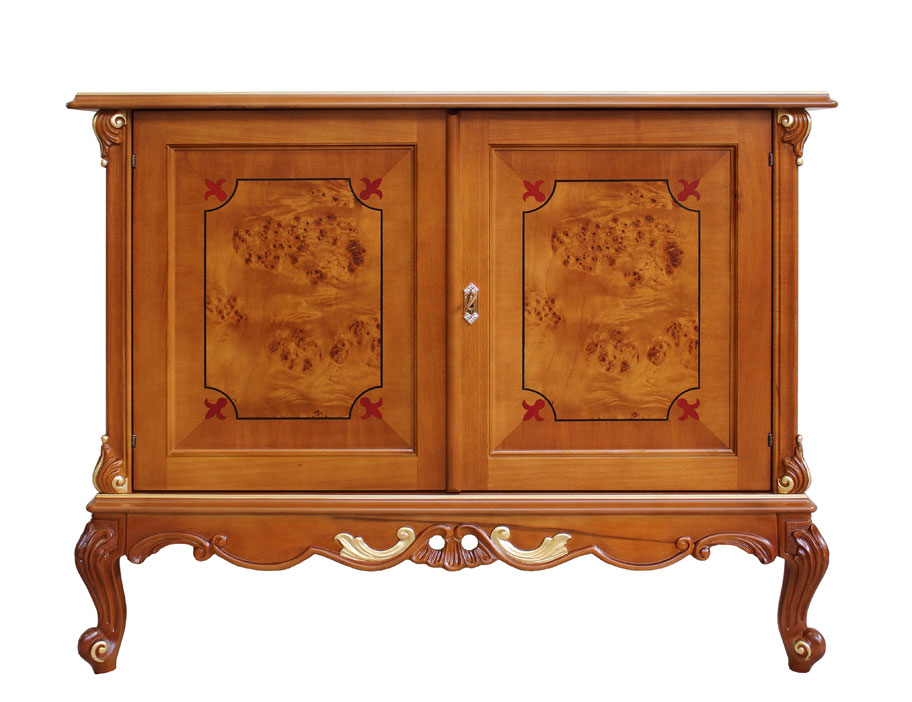 Credenza con radica e intagli dalla raffinata classicità. Il suo punto di forza risiede soprattutto nello splendido piede intagliato, valorizzato con preziosi particolari in foglia oro. La capienza di questa credenza è particolarmente generosa. All'interno vi è un grande ripiano per ottimizzare lo spazio a disposizione. Le ante sono valorizzate da un inserto centrale in radica con intarsio di motivi stilizzati in prossimità degli angoli.