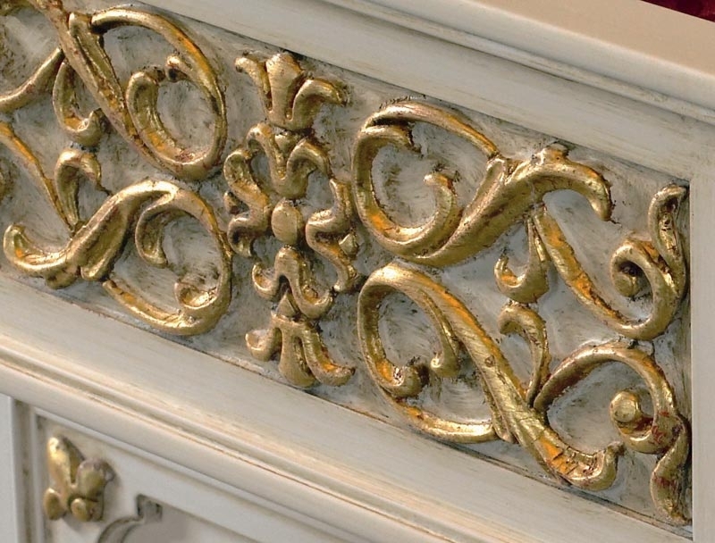 La laccatura è impreziosita da una patinatura che dona all'intera struttura il fascino di tempi passati. Le lavorazioni particolari sono evidenziati da foglia oro che sottolinea l'affascinante aspetto di un intaglio di altissimo valore.