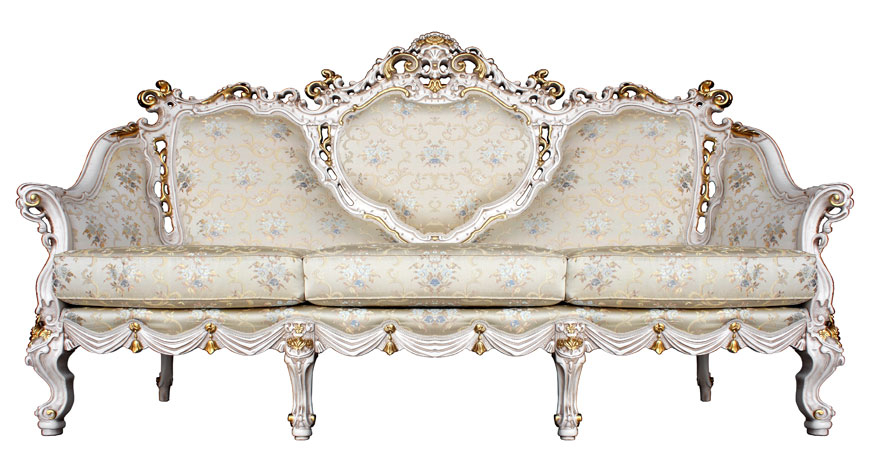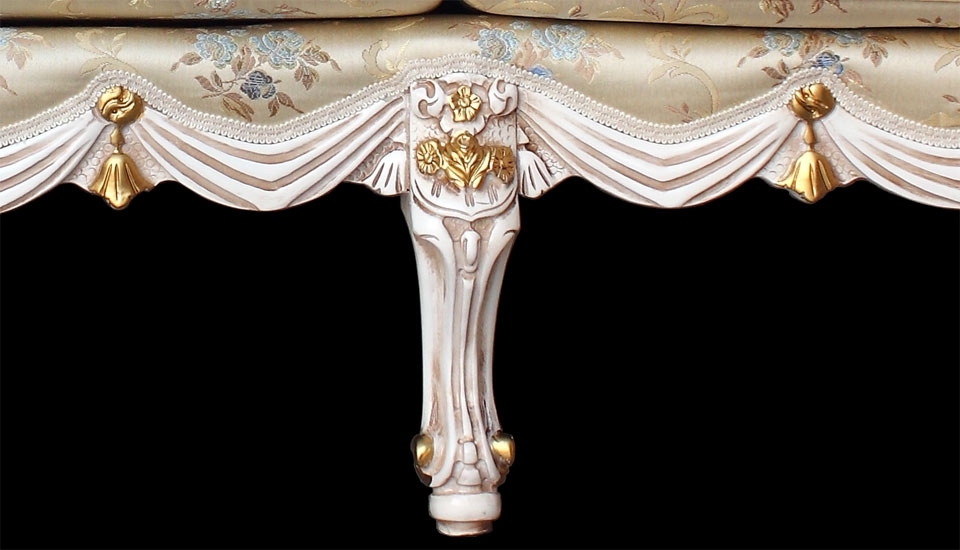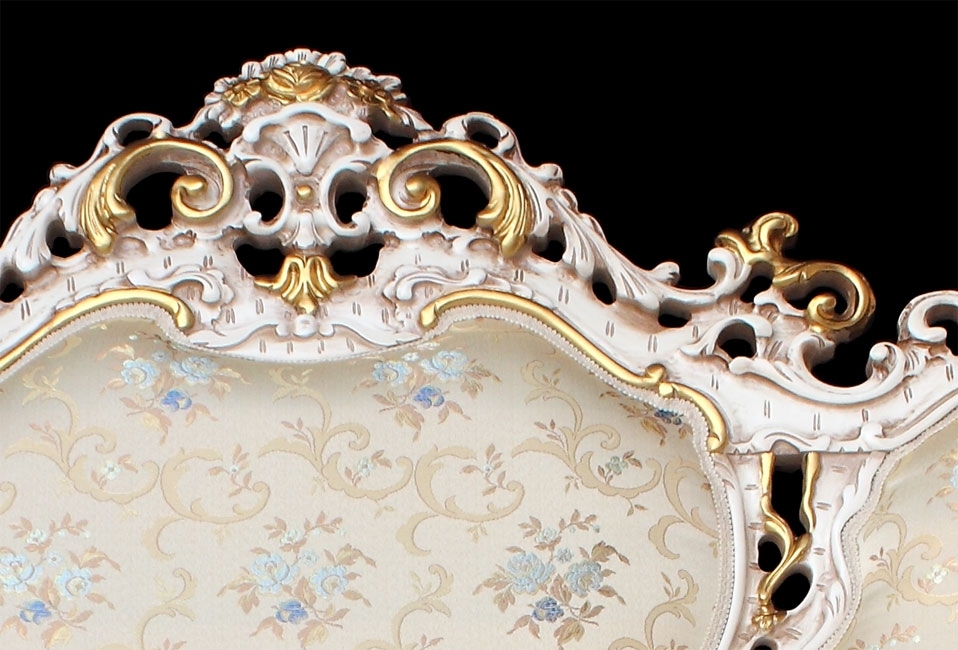 Spettacolare divano di lusso, unico. Un capolavoro di artigianalità certosina. La struttura in legno di faggio è sapientemente intagliata e rifinita con un gradevolissimo mix di foglia oro e argento su una laccatura anticata, rendendo questo oggetto una vera gioia per gli occhi.