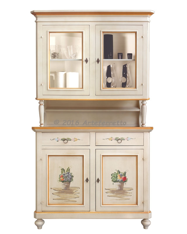 In stile arte povera, questa credenza con alzata, grazie alla particolare laccatura invecchiata e all'abbellimento donato da una decorazione con soggetto tradizionale, crea l'atmosfera tipica del caldo ambiente da cucina di una volta.