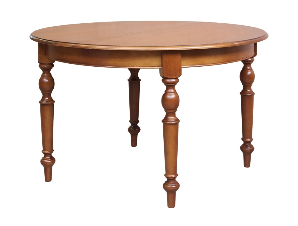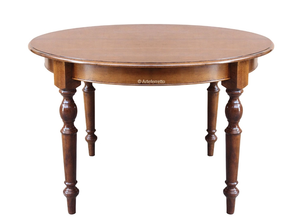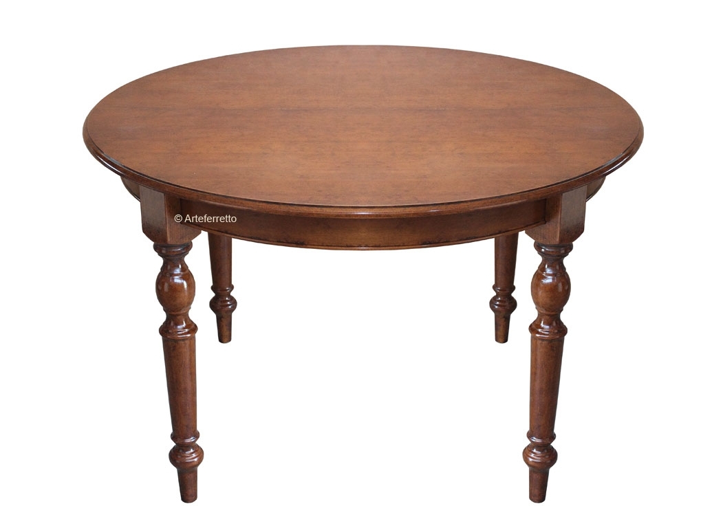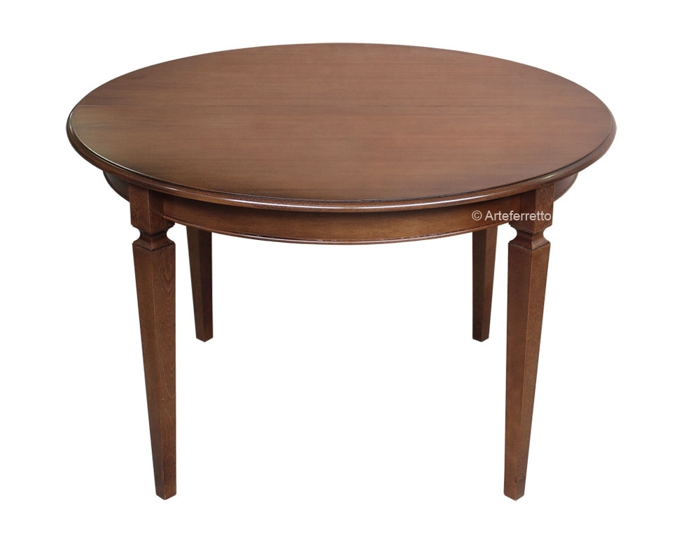 Solido tavolo rotondo con diametro da cm 120, provvisto di allunga centrale da 38 cm.