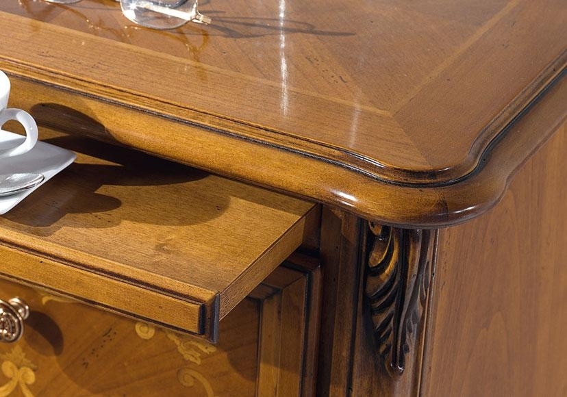 Le facciate dei due cassetti (in legno listellare lavorato a coda di rondine) compongono un disegno di delicati intarsi raccolti dentro una cornice in massello sopra il quale un utile e discreto tiretto fa bella presenza di sé appena sotto il top, arrotondato negli angoli e a sua volta intarsiato con pregiate essenze di legno dalle meravigliose venature.