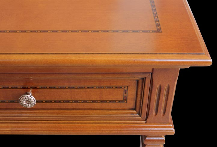 La sua linea è estremamente elegante, resa ancor più apprezzabile per il pregio dei materiali utilizzati. Legno massello di faggio e toulipier costituiscono la struttura che ospita elementi arricchiti da un sapiente intarsio di essenze naturali legnose.