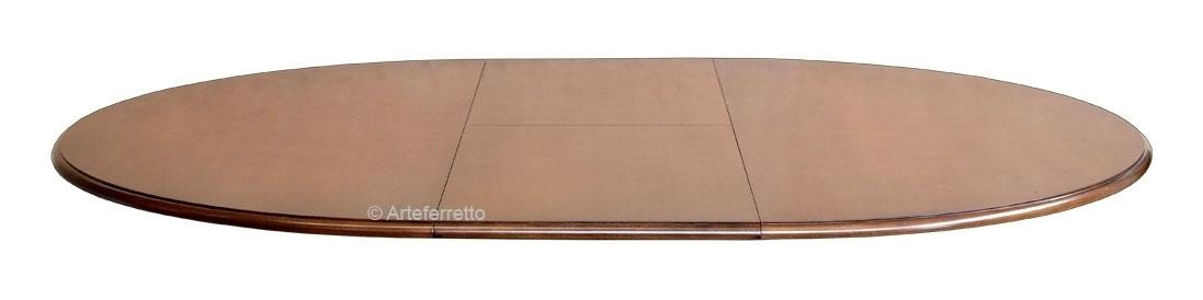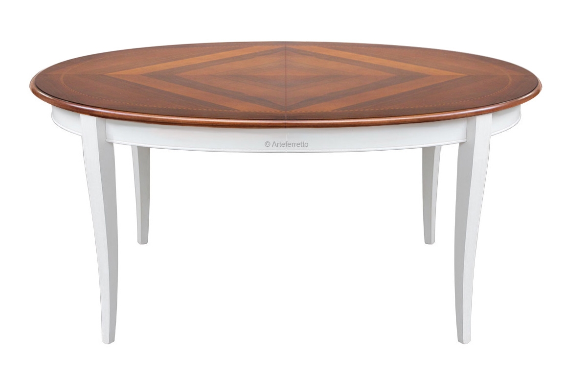 Tavolo ovale bicolore, solido e funzionale, si fa apprezzare per il suo stile classico e versatile. La parte inferiore, composta dalle gambe slanciate e stilizzate, si dimostra molto solida e robusta. La candida laccatura crea un piacevole contrasto con la calda tonalità del piano arricchito da un originale e pregevole intarsio. La sua superficie può essere agevolmente estesa attraverso un pratico meccanismo di allunghe.