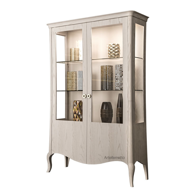 Poi, scendendo, apprezzi la particolare sagoma dell'anta che, ripresa la curva della parte superiore, scende lasciando ampia visibilità all'interno, impreziosito da ripiani in legno o cristallo, dal fondo in tinta o tappezzato con splendido, ma allo stesso tempo discreto, tessuto.