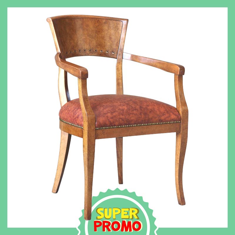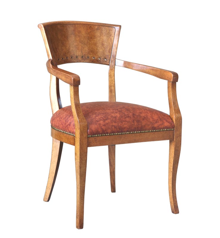 Sedia con braccioli di ottima struttura. Bella e affidabile, presenta una linea essenziale e moderatamente stilizzata con elementi lavorati sullo schienale.