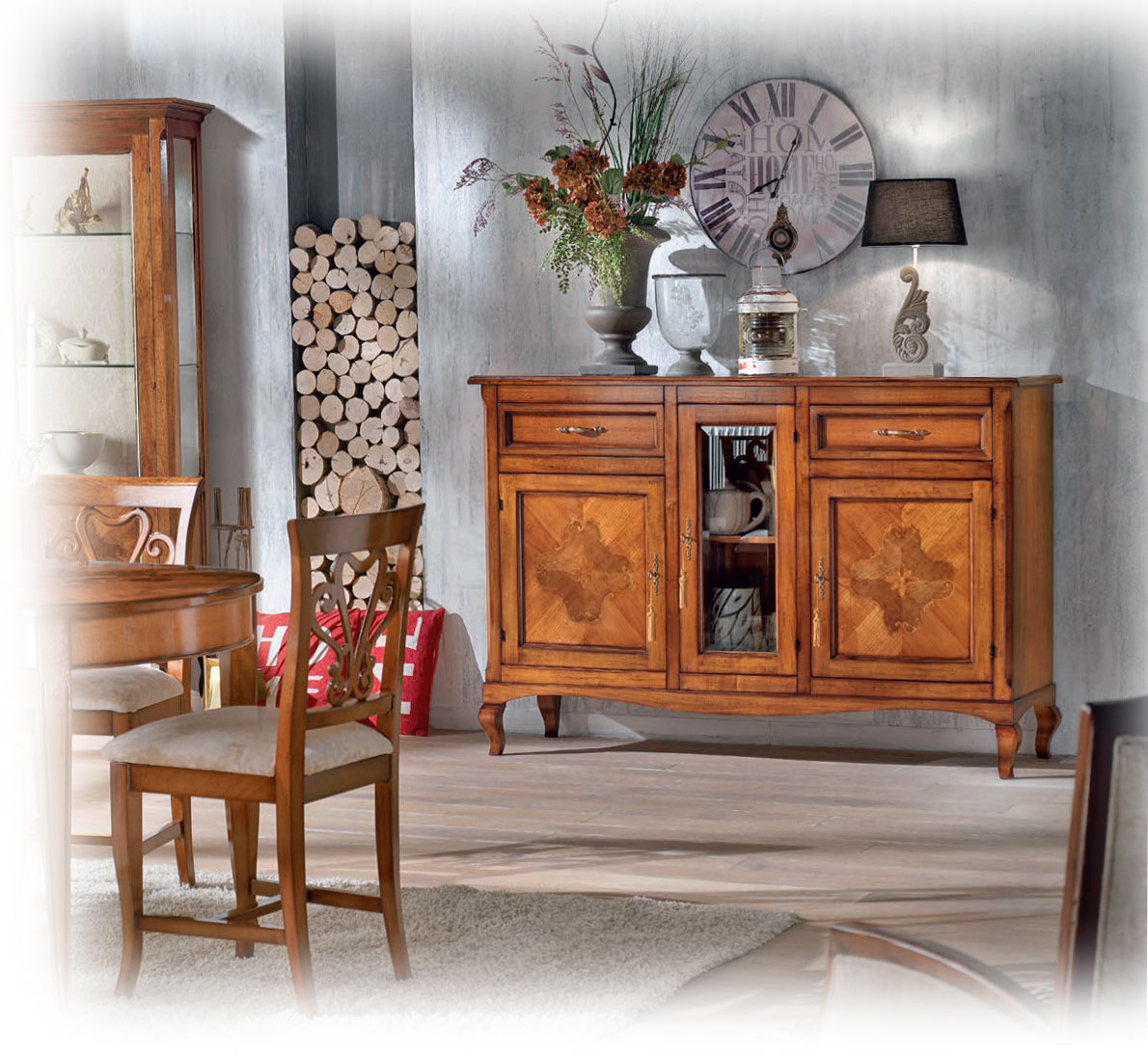 Credenza classica 2 ante intarsiate che può essere collocata nella sala da pranzo, in soggiorno o anche nell'ingresso.