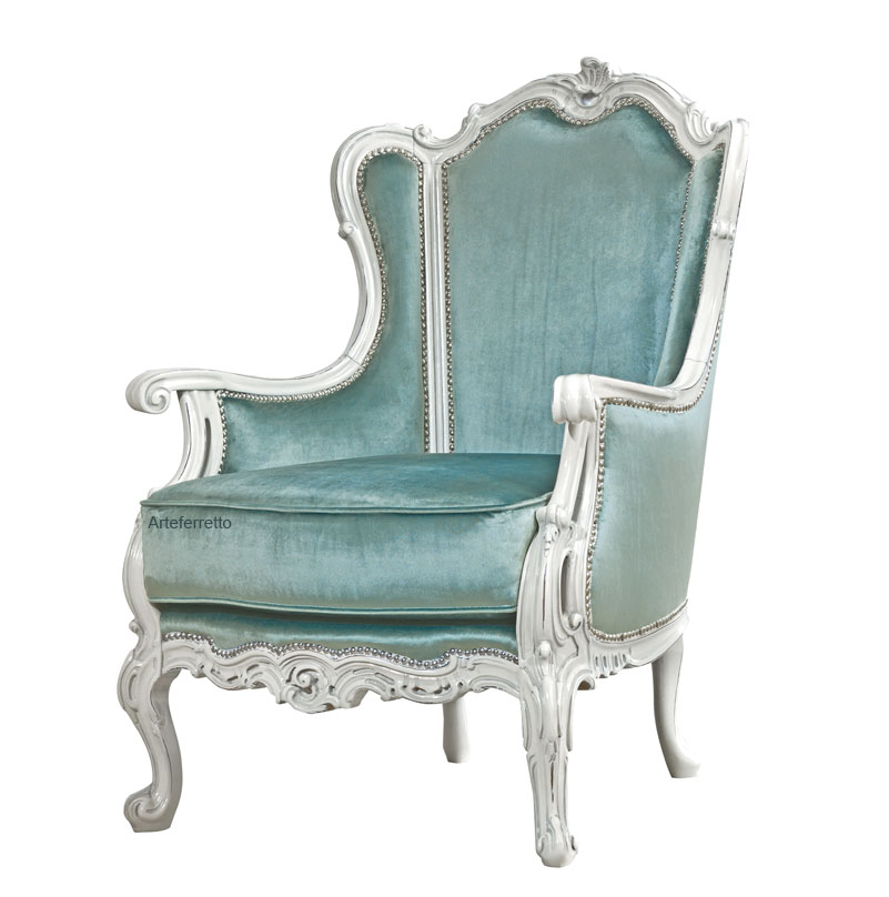 Poltrona di grande eleganza, abbina ad una struttura ricca e minuziosamente rifinita da bellissimi intagli, un aspetto di luminosa freschezza di stile.
