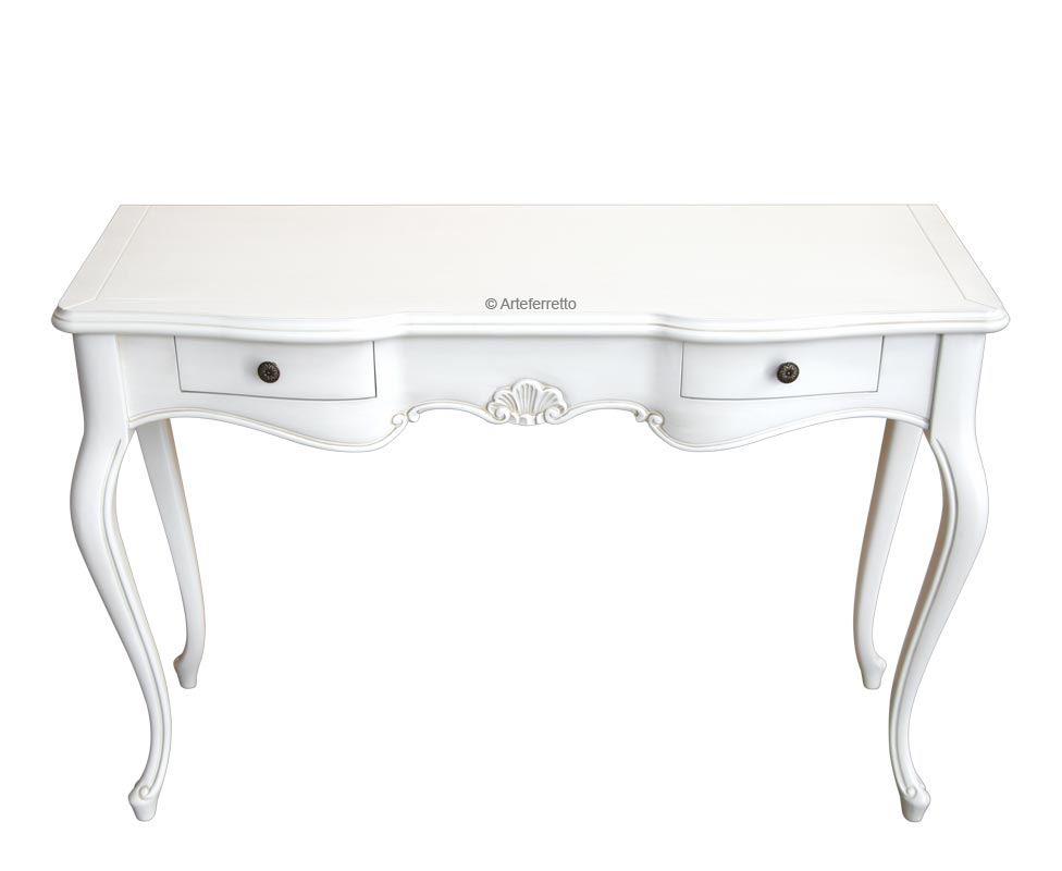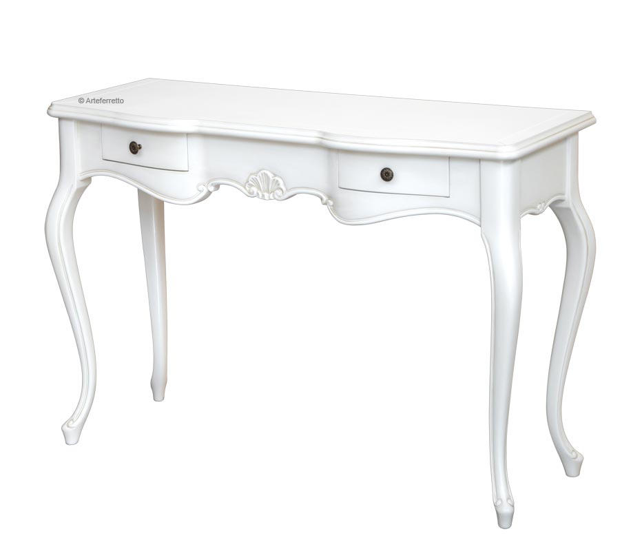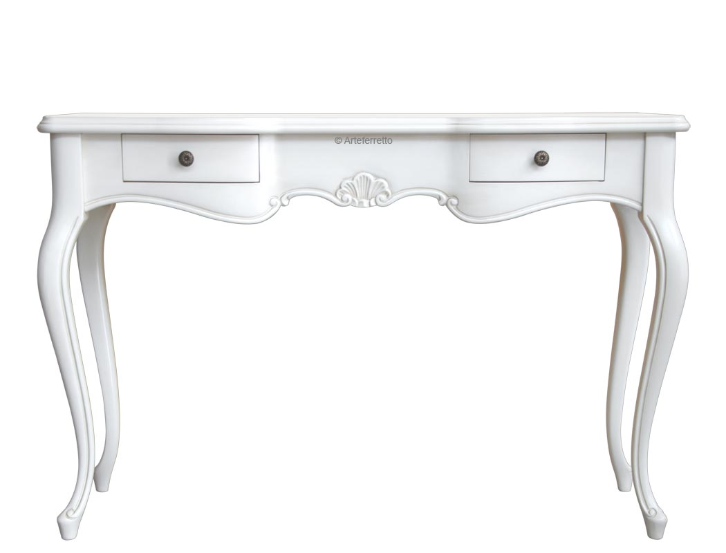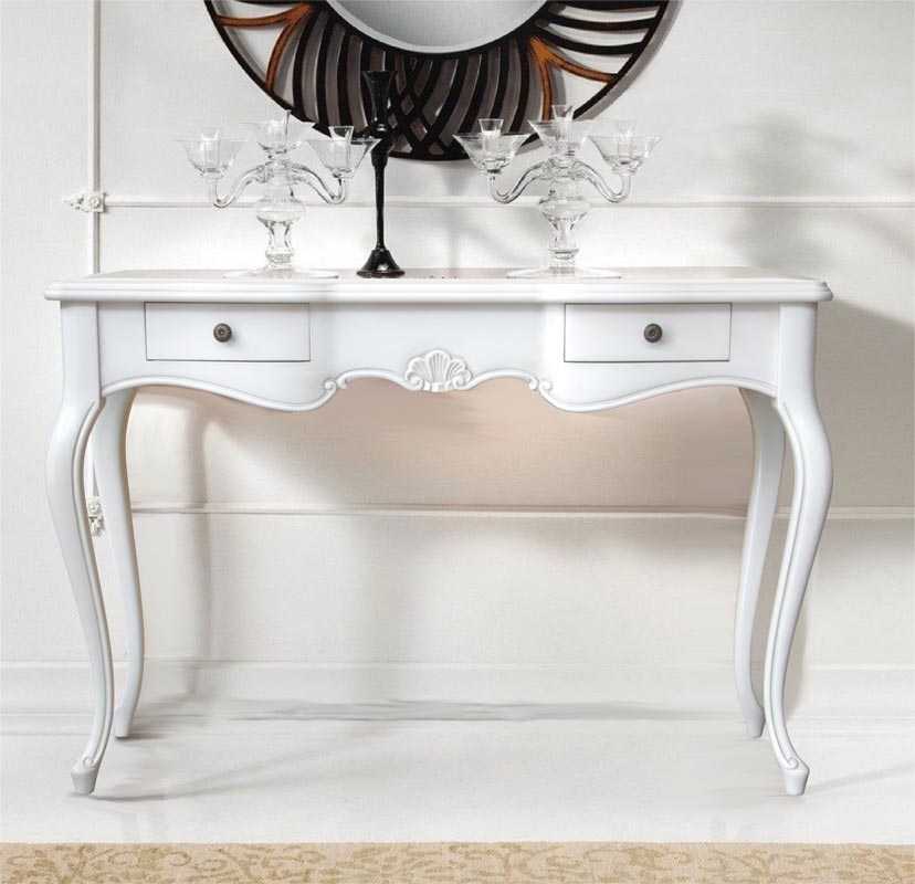Consolle dalla linea morbida e raffinata. La sua struttura, dolcemente sagomata su legno massello, segue una linea armoniosa che converge centralmente in un delicato intaglio centrale a forma di conchiglia.