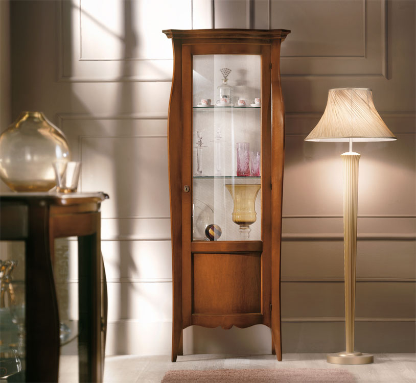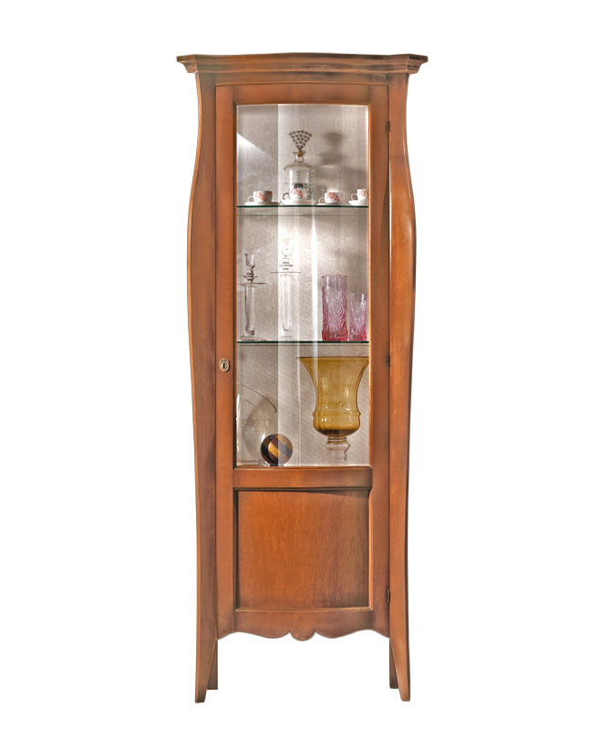 Rinomato prodotto artigianale, questa vetrina dalla linea originale è realizzata in legno massello di toulipier e presenta lavorazioni di grande pregio soprattutto per quanto concerne le robuste spalle anteriori.
