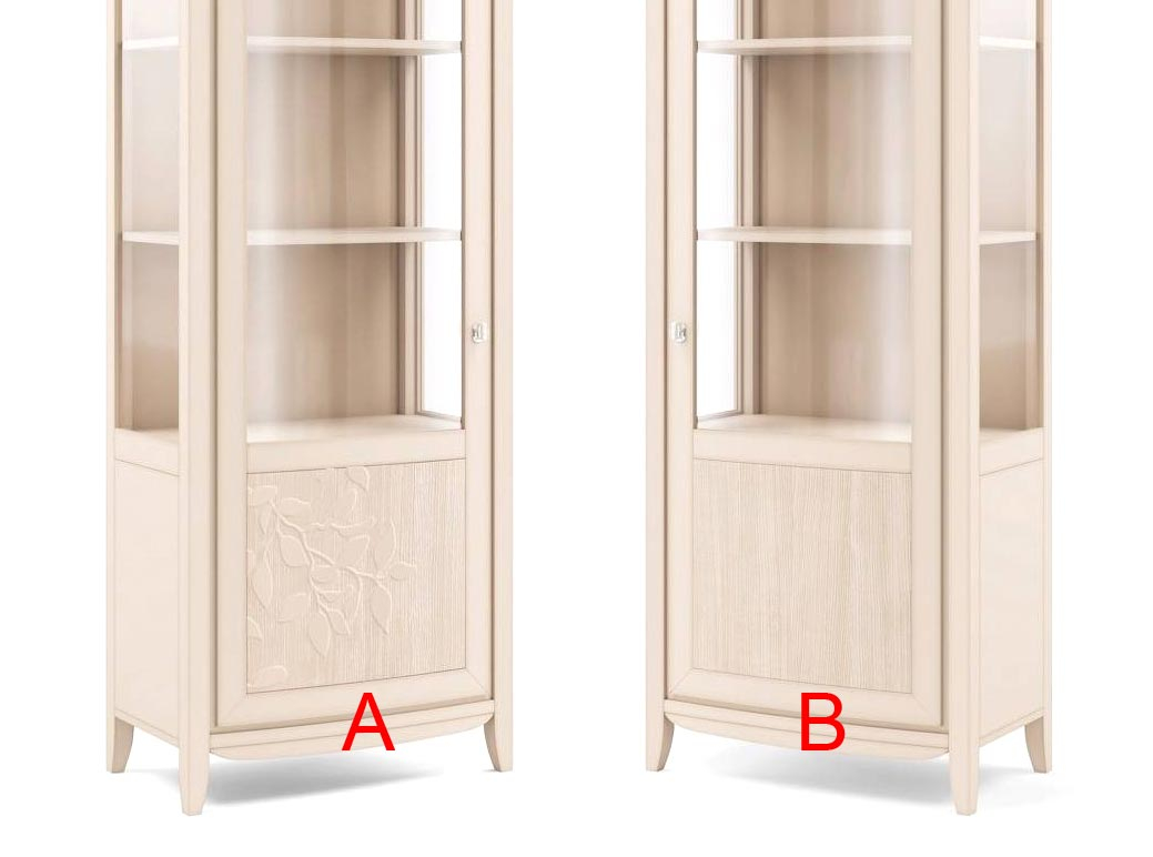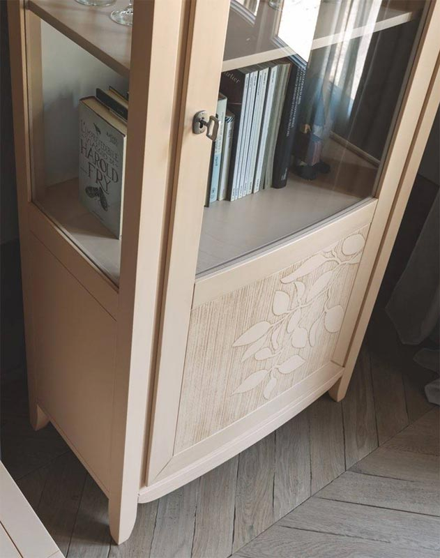 Linea contemporanea impreziosita dall’originale decoro a foglie nella parte bassa dove l’anta è chiusa dal legno, per sottolineare l’anima classica di questo mobile. Facciata leggermente curva per dare armonia ad una linea di essenziale bellezza.