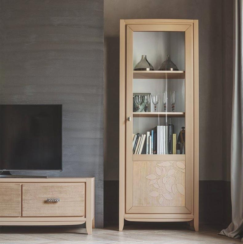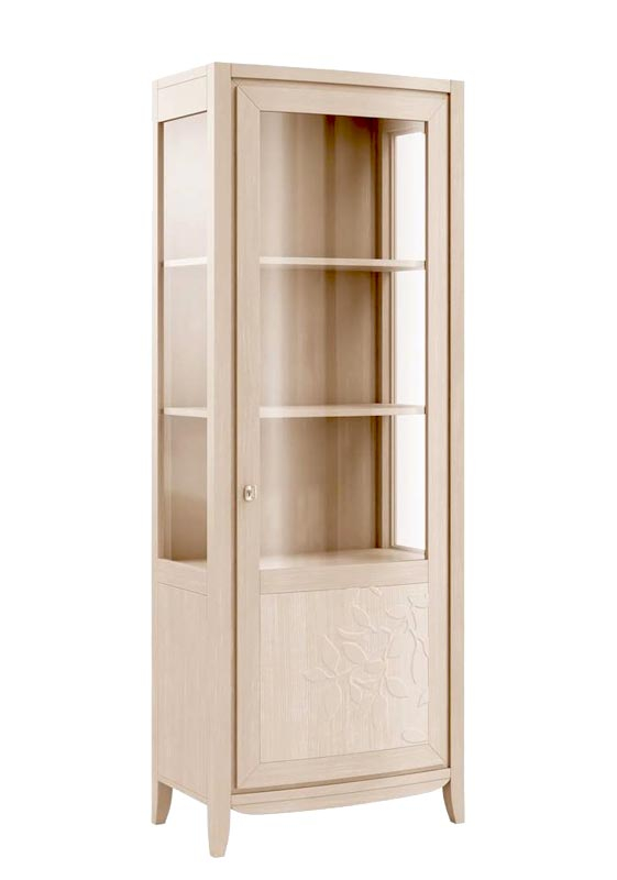 Affascinante vetrina cristalliera ad anta singola, con solida struttura in legno di tiglio massello e pannelli in multistrati di pioppo, che con le sue belle venature dona un tocco di naturalezza.
