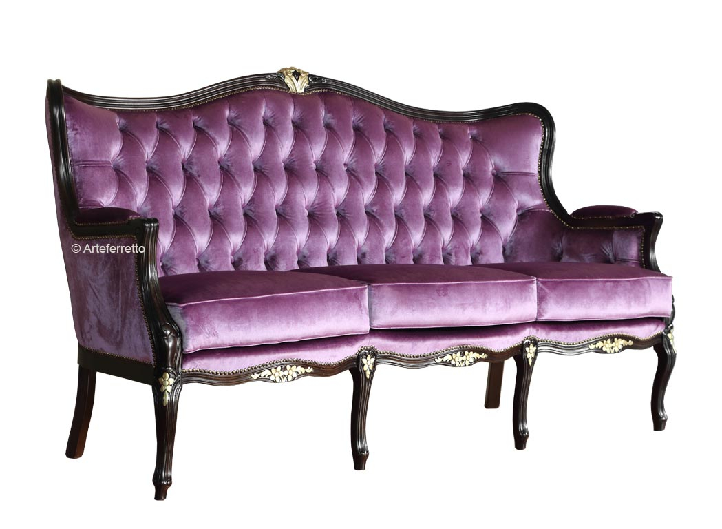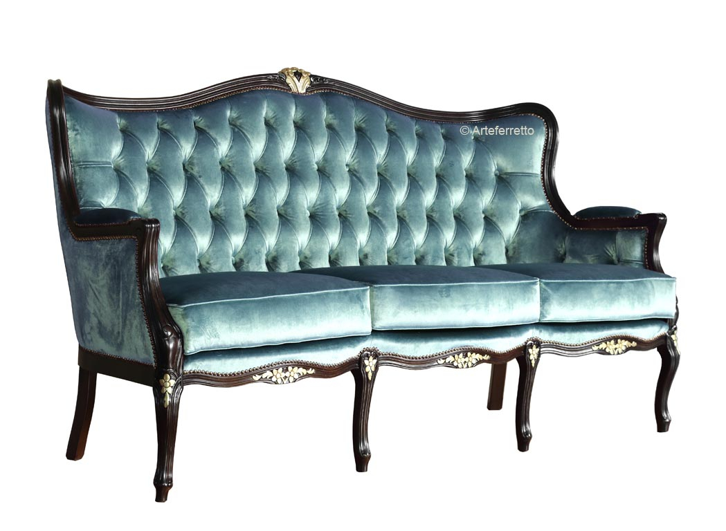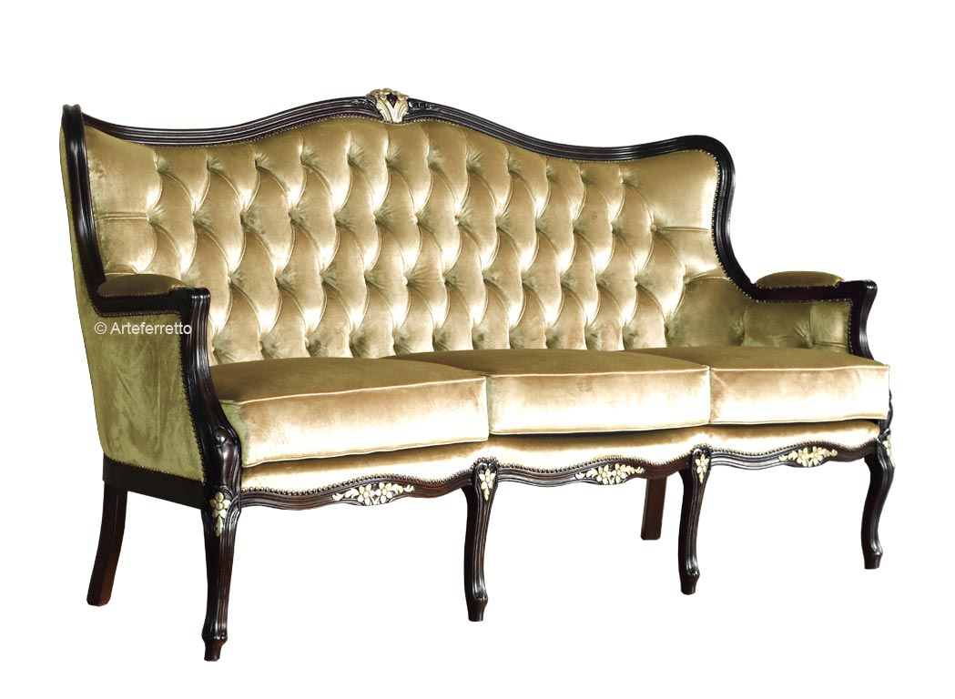 Divano classico 3 posti è realizzato in legno di faggio, lavorato secondo linee dolci e impreziosite da piccoli intagli floreali frontali.