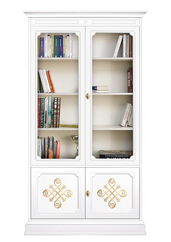 Libreria vetrina con ante in vetro e in legno chiuse da chiave per tenere al sicuro i vostri oggetti. La maniglieria non è comunque un elemento da sottovalutare, anzi è un tocco in più che ben si abbina ai fregi in foglia oro.