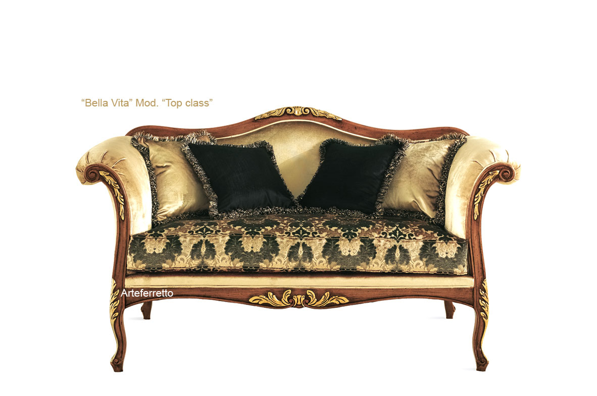 Raffinato divanetto che associa ad una elegante struttura in legno finemente intagliato una preziosa tappezzeria.