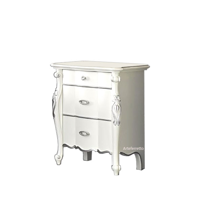 È lo stile bello fresco e luminoso che piace e valorizza le case di oggi. Laccatura accurata, applicata artigianalmente con l’aggiunta, poi, di particolari di alta qualità artistica. Decorazioni in oro per un motivo floreale che abbraccia l’intera facciata senza distinzione tra cassetto e cassetto. Bordi e profili in foglia oro esaltano le dolci sagome ricavate con sapiente lavorazione del legno più pregiato.