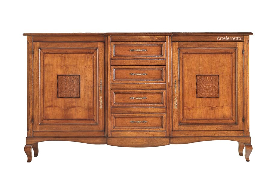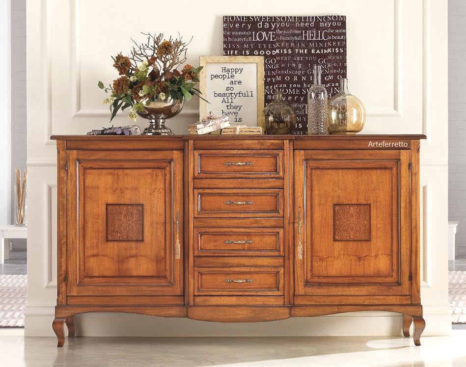 La sua bellezza deriva da linee classiche dalle geometrie pulite, presentando centralmente 4 capienti cassetti e lateralmente due ante, impreziosite da un ricercato intarsio centrale, che racchiudono un ampio spazio ottimizzato da un ripiano interno.