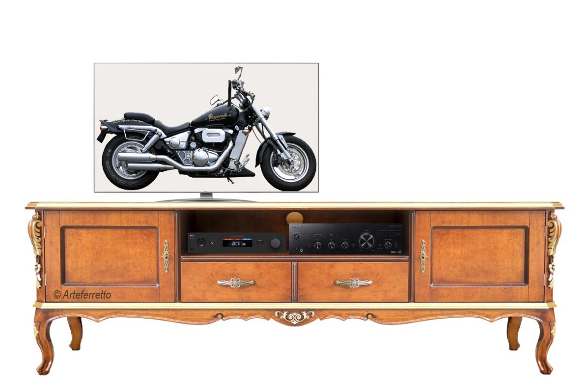 La sua struttura è molto resistente adatta anche a sostenere televisori di importanti dimensioni. L’estrema eleganza della foglia oro, applicata ai motivi intagliati a mano sul legno della struttura, danno pregio e raffinatezza alle linee semplici delle porte laterali.