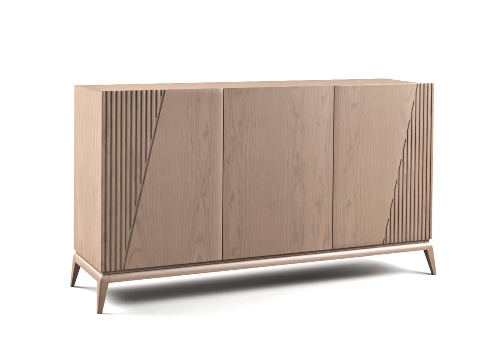 Raffinata madia dal bel basamento in legno massello di frassino. La struttura è suddivisa in due spazi: uno doppio e uno racchiuso da un'anta singola.