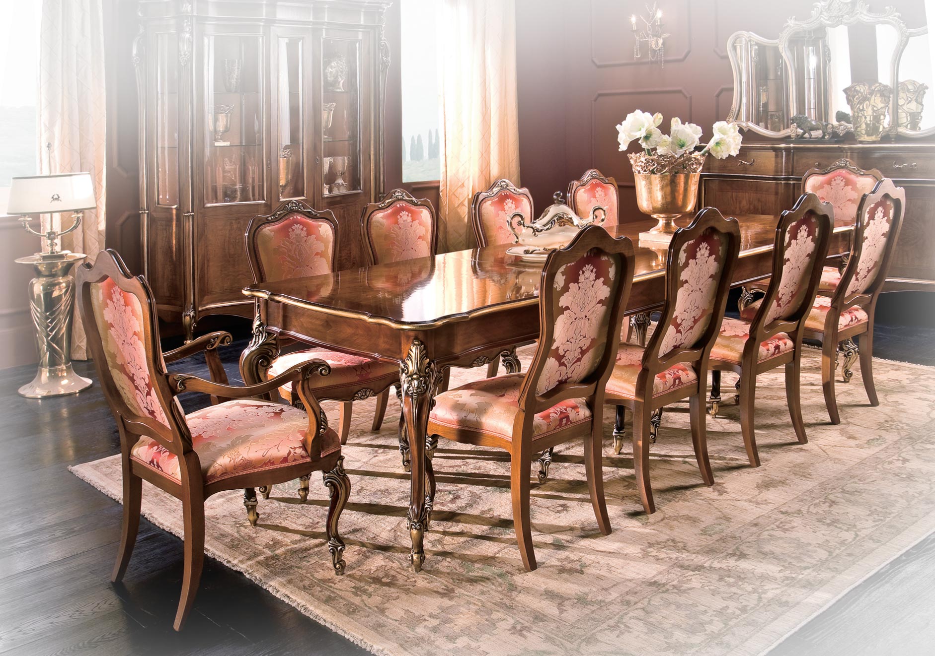 Questo tavolo introduce ad un ambiente da sogno, con i suoi intarsi, i suoi intagli, la sagoma sinuosa e i dettagli in foglia oro, cattura gli sguardi e li tiene posati su di sé, per farsi ammirare elargendo bellezza ed armonia.