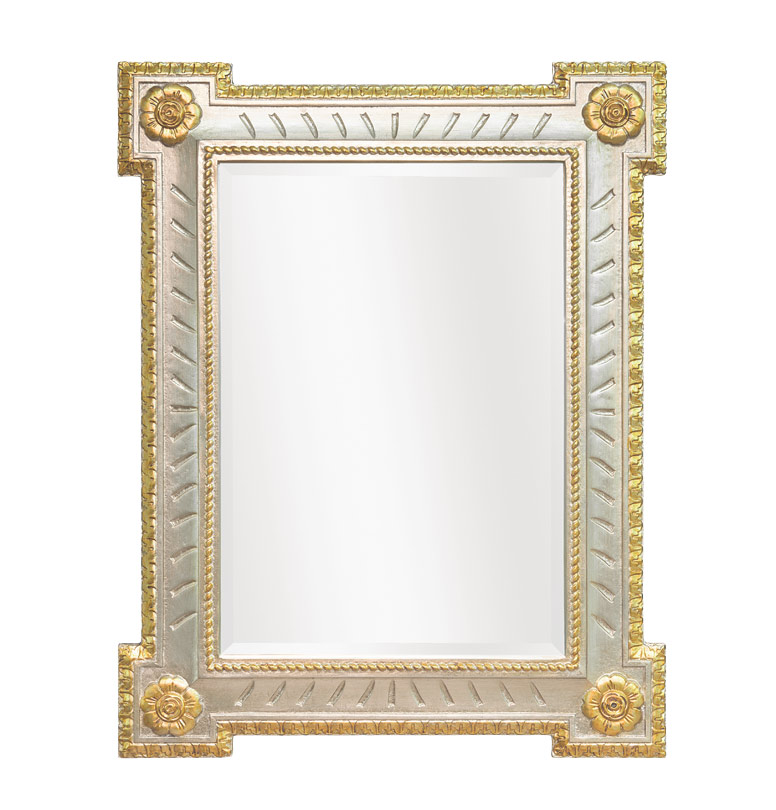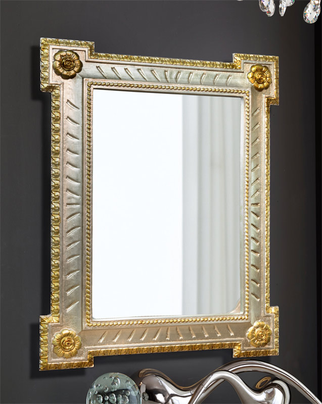 Cornice intagliata, rivestita in foglia argento e contornata da un cordone decorato in foglia oro; angoli sagomati, valorizzati da quattro fiori in rilievo.