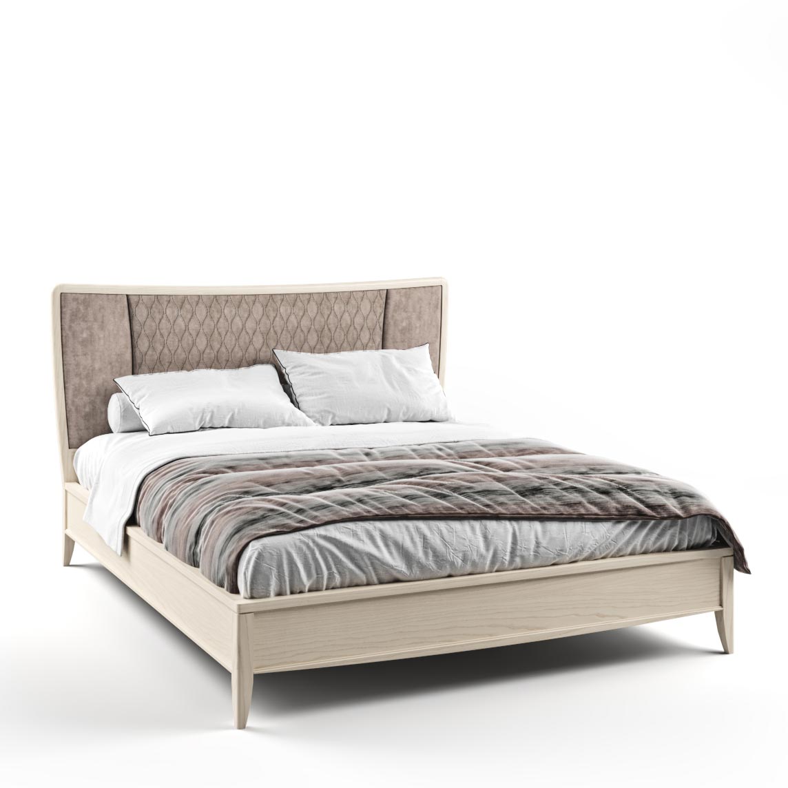 Letto con testata imbottita, con una linea armonizzata che acquista fascino grazie alle stupende venature del legno di frassino.