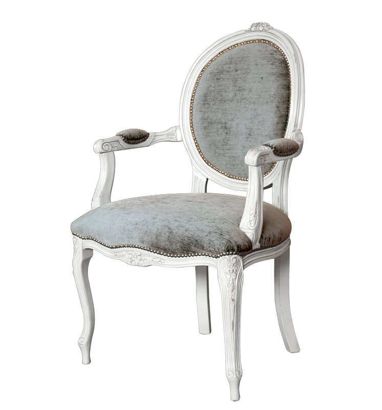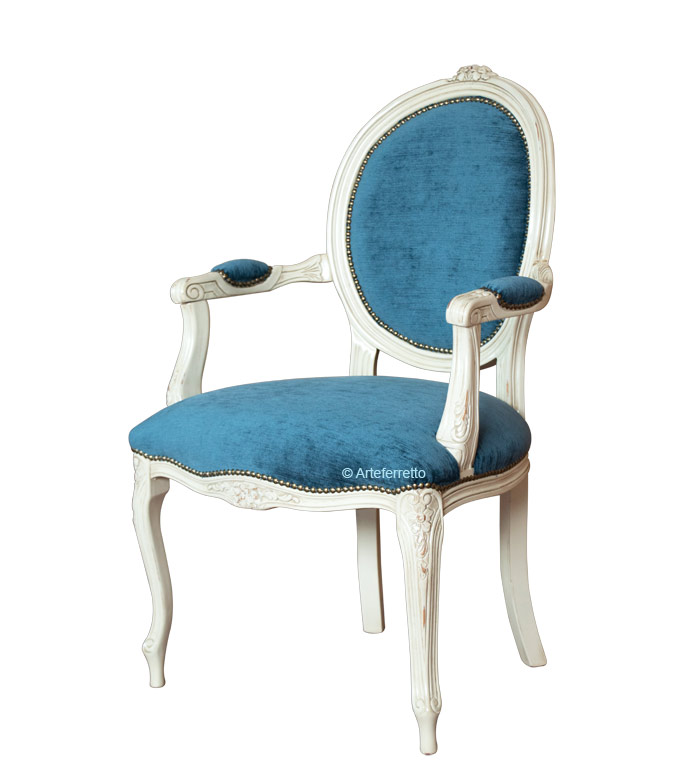 Affascinante poltroncina in stile classico che abbina un'accurata laccatura del telaio in legno ad una elegante tappezzeria di pregiati tessuti.