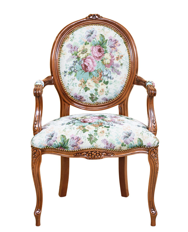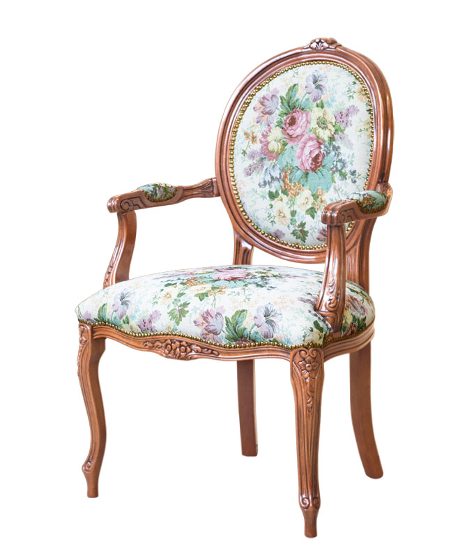 Affascinante poltroncina in stile classico che abbina un'accurata laccatura del telaio in legno ad una elegante tappezzeria di pregiati tessuti.