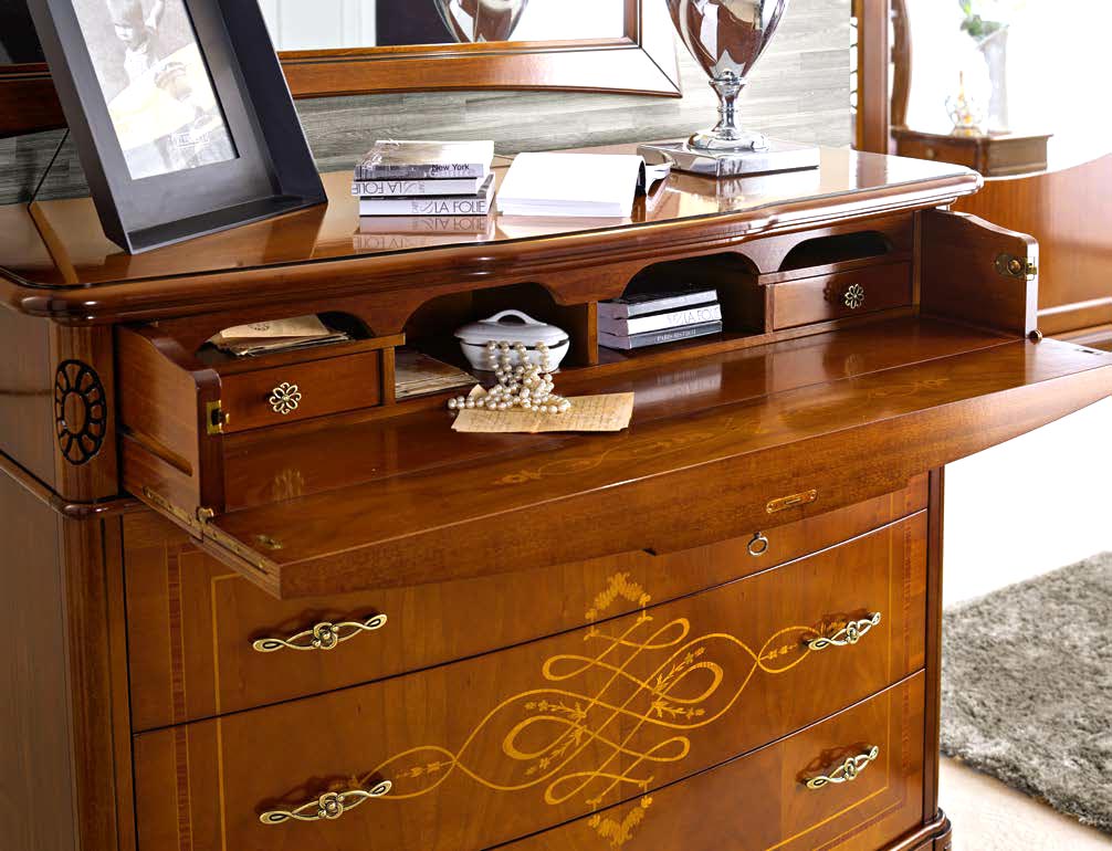 Favoloso comò classico in legno per la zona notte, di autentica lavorazione artigianale.La struttura solida e poderosa, dimostra una qualità decisamente affidabile e durevole nel tempo.La parte frontale è caratterizzata da una leggera bombatura che armonizza e addolcisce il profilo del mobile.Pregiati intagli su legno valorizzano le belle linee del mobile.Ulteriore elemento di pregio è l'elaborato intaglio centrale sul cassetto superiore. Anche le spalle in legno sono arricchite da un bell'elemento intagliato.Oltre alla raffinata estetica, il mobile dispone di una buona capienza, garantita dai 3 ampi cassetti ai quali si aggiunge quello superiore dalle dimensioni più ridotte.Strutturalmente questo mobile si avvale dei migliori materiali e delle collaudate tecniche di costruzione che ne fanno un oggetto garantito a vita.Colto nell'aspetto d'insieme il comò presenta un fascino assoluto e una classe impareggiabile.Un mobile eccezionale, in grado di rendere la zona notte un luogo da sogno.Dimensioni:larghezza 130 cm;profondità 55,5 cm;altezza 94 cm.