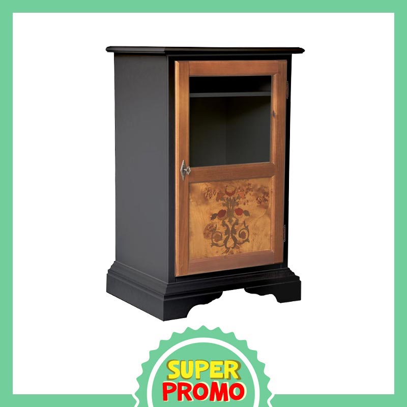 Elegante dalla solida struttura è realizzato con materiali di ottima qualità: Legno di toulipier massello e pannelli di noce tanganica; intarsio floreale molto delicato sulla parte principale dell'anta.