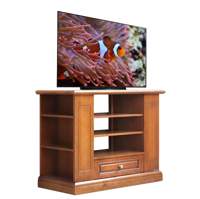 Questo modello è particolarmente indicato per TV fino a 37 pollici e, a richiesta, può essere dotato di robuste ruote rese invisibili dal robusto zoccolo in legno.