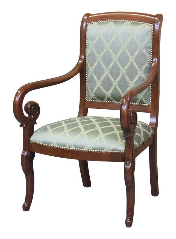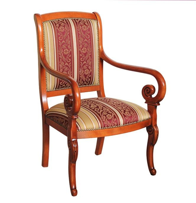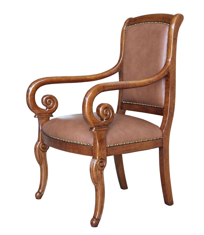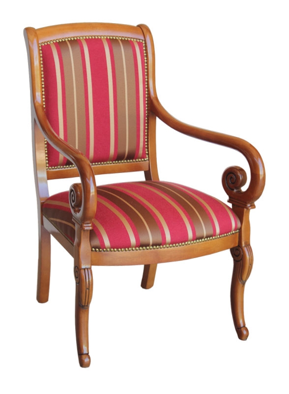 Bella e comoda poltrona con braccioli in legno dalla forma stilizzata.