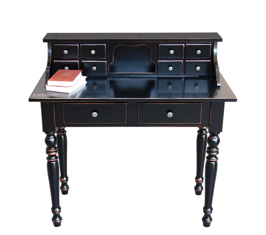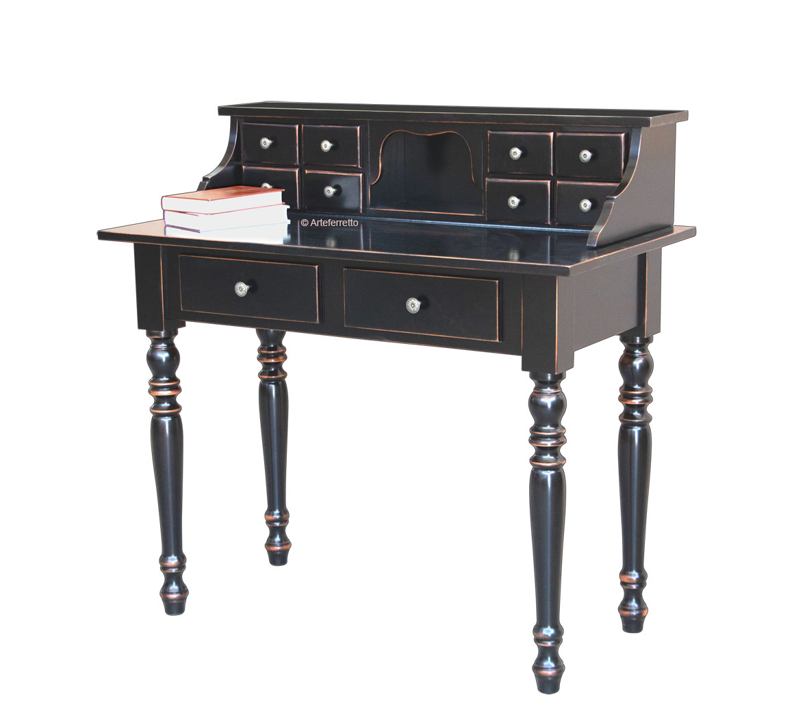 Elegante scrittoio classico dalle dimensioni contenute, abbinato ad un’alzatina composta da 8 funzionali cassettini e un piccolo vano a giorno dal contorno morbido.