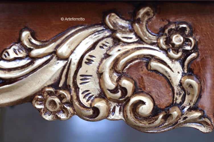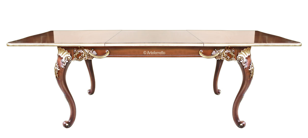 Il piano, grazie ad un gioco di venature del legno e un intarsio di grande eleganza, si esalta nella bella lucidatura che trasmette tutto il calore del legno naturale. Il piano di questo tavolo rettangolare è fisso.