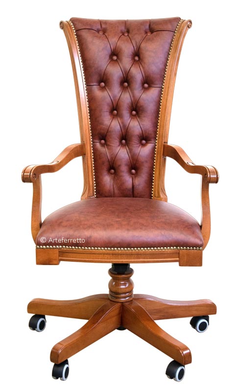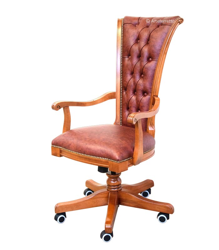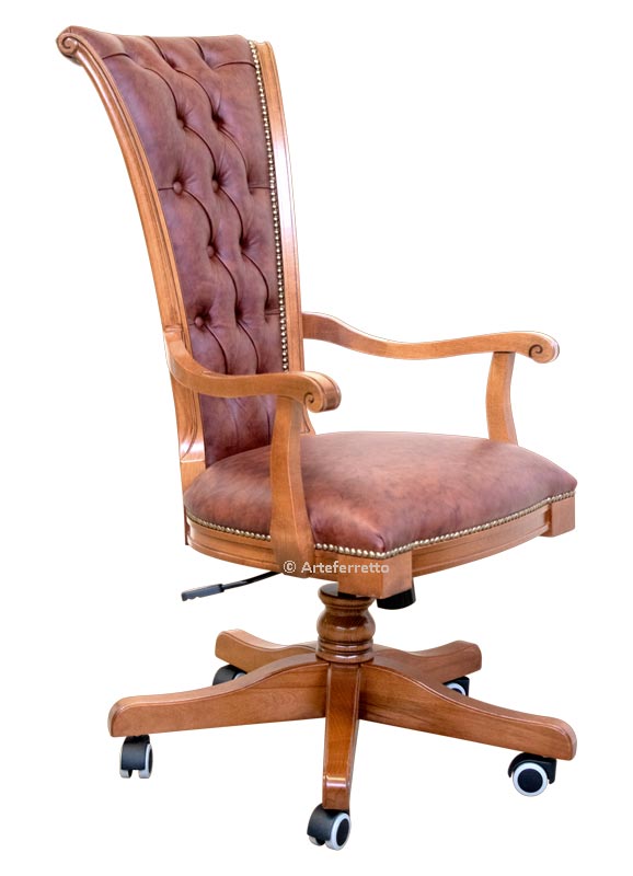 La pregiata lavorazione della vera pelle di tipo "Bulgara" con il caratteristico capitonné nello schienale, accostata al solido telaio in legno di faggio, dona un effetto strabiliante a questo splendida poltrona girevole.