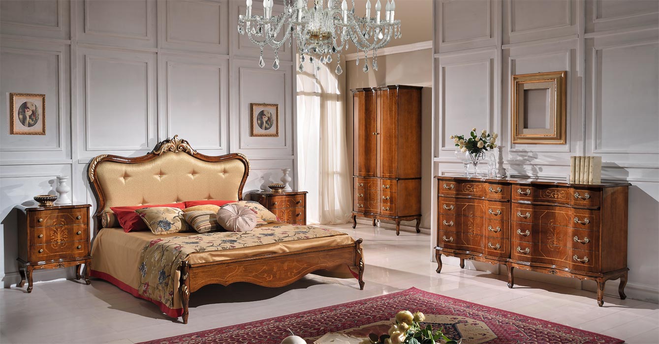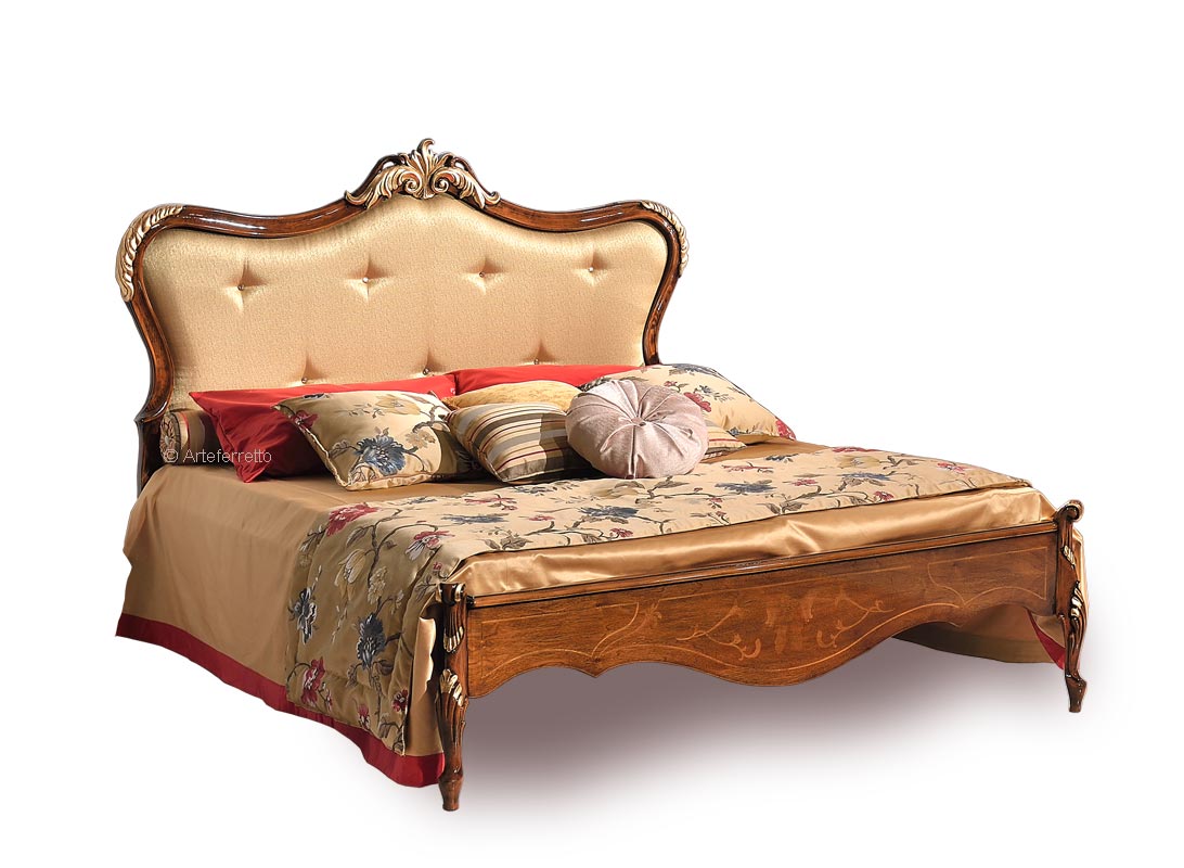 La perfetta laccatura con una leggera patinatura esalta le lavorazioni del legno (massello di tiglio). La sua sagoma è intervallata da raffinati e preziosi intagli, rifiniti e valorizzati da finiture in foglia oro. La tappezzeria della testata segue il profilo del telaio con una fascia di morbido tessuto dalla calda tonalità, la quale raccorda la parte centrale imbottita e lavorata capitonné. Lo stesso motivo di tappezzeria con tessuto lavorato a pieghe, segue tutto il giroletto esaltando la sensazione di lussuosa delicatezza.