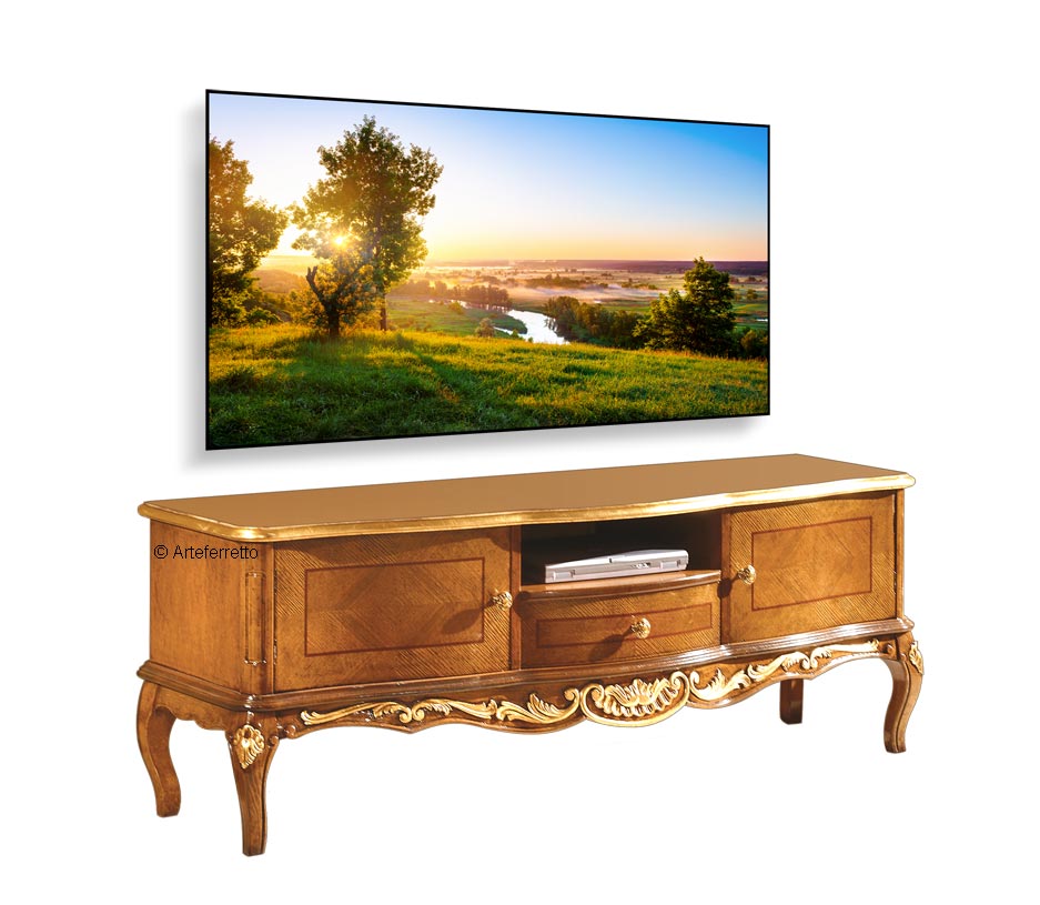 Il suo pregiato basamento in legno intagliato e rifinito in oro lascia spazio a raffinati intarsi di essenze pregiate di legno che caratterizzano le belle facciate di porte e cassetto.