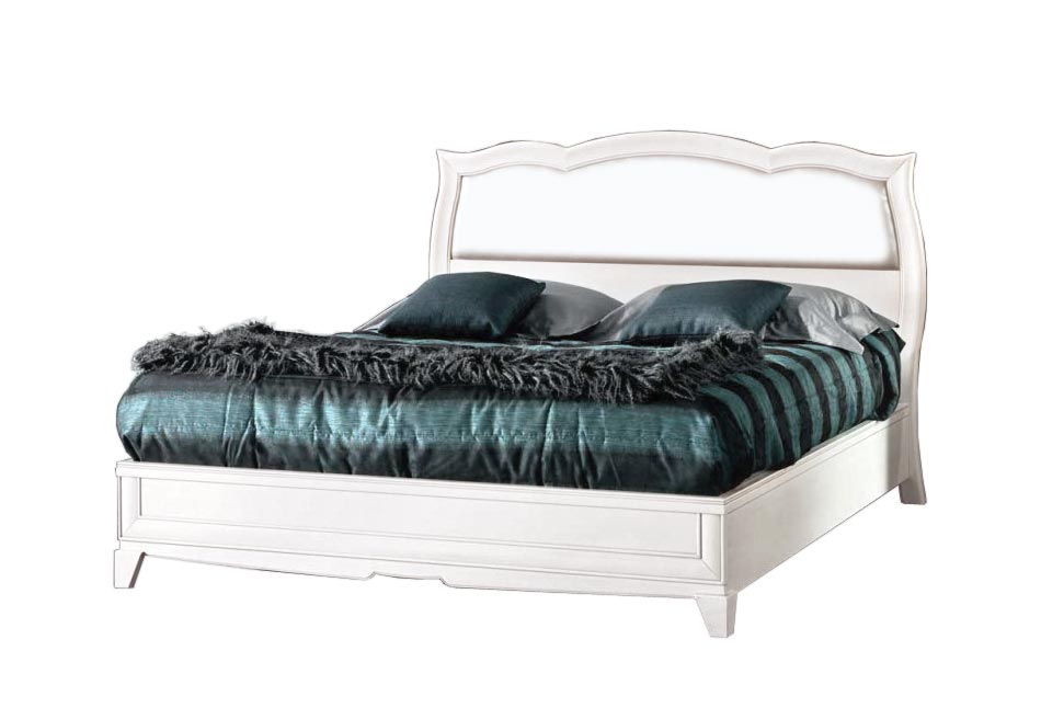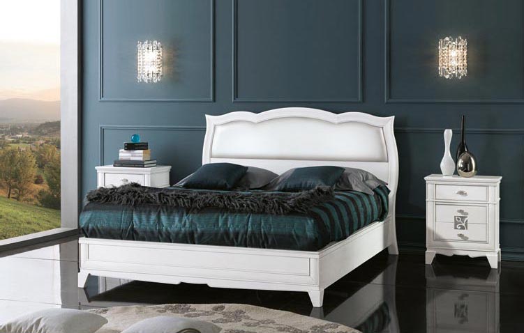 La perfetta laccatura con una leggera patinatura esalta le lavorazioni del legno (massello di tiglio). La sua sagoma è intervallata da raffinati e preziosi intagli, rifiniti e valorizzati da finiture in foglia oro. La tappezzeria della testata segue il profilo del telaio con una fascia di morbido tessuto dalla calda tonalità, la quale raccorda la parte centrale imbottita e lavorata capitonné. Lo stesso motivo di tappezzeria con tessuto lavorato a pieghe, segue tutto il giroletto esaltando la sensazione di lussuosa delicatezza.