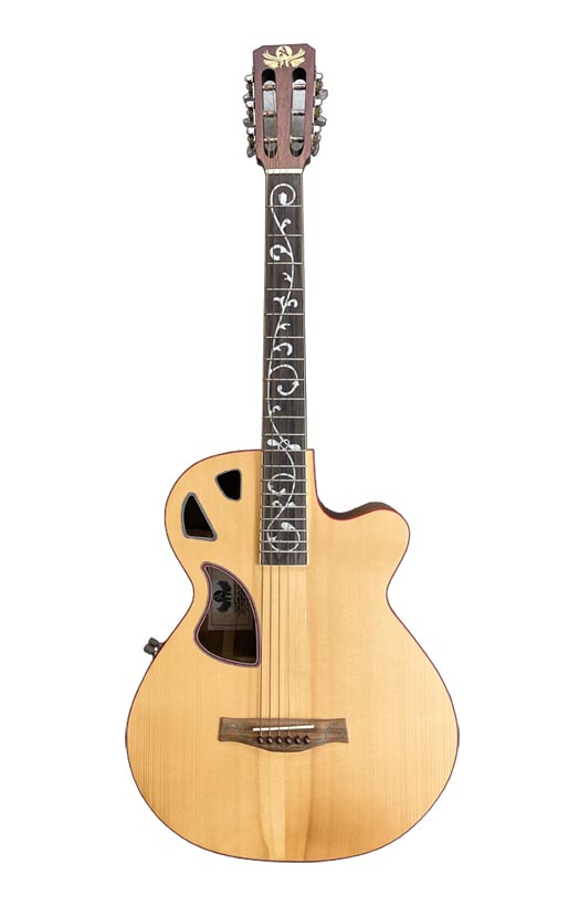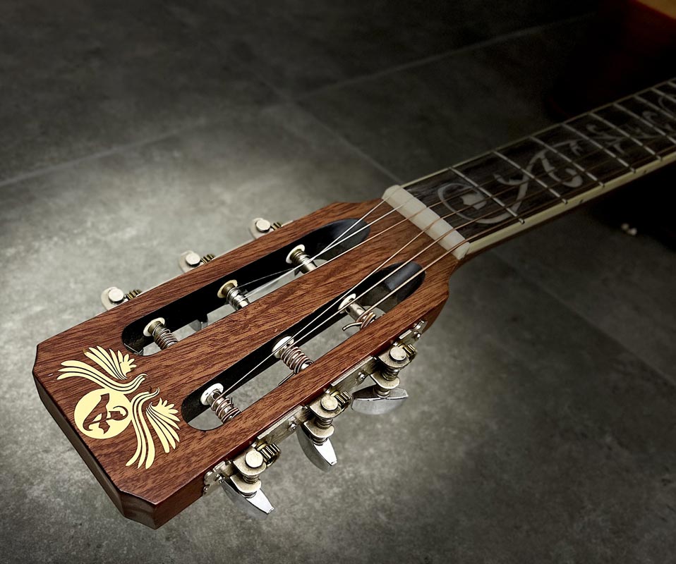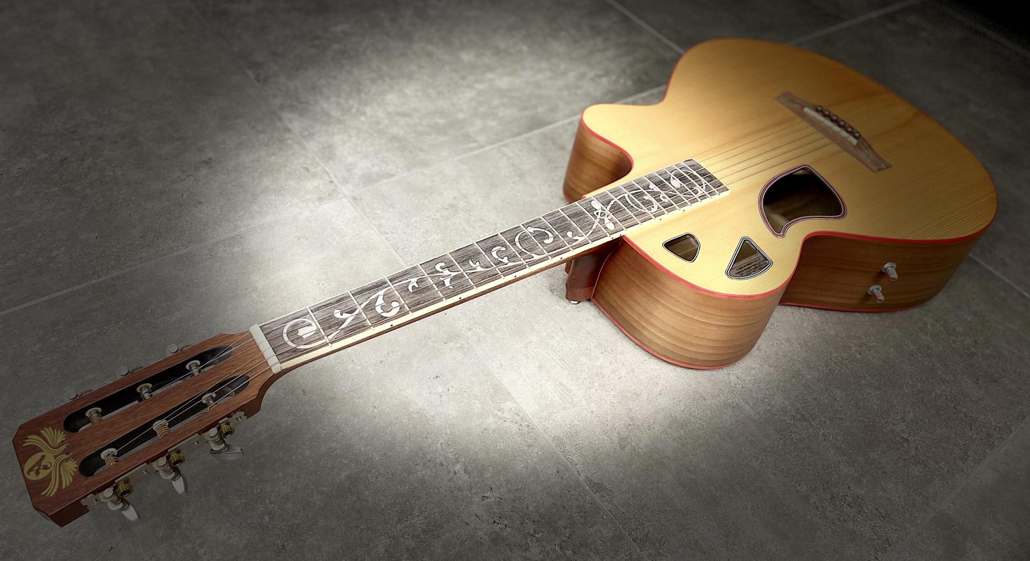Tavola armonica in abete della val di fiemme Fondo e fasce in tanganika marezzato Manico in acero marezzato a forma “U” sottile Tastiera in palissandro con intarsio floreale. Diapason 650mm Battipenna e paraspigoli in legno marezzato Ponte e capotasto in osso naturale Meccaniche autobloccanti Incatenatura a X Finitura poliuretanica satinata