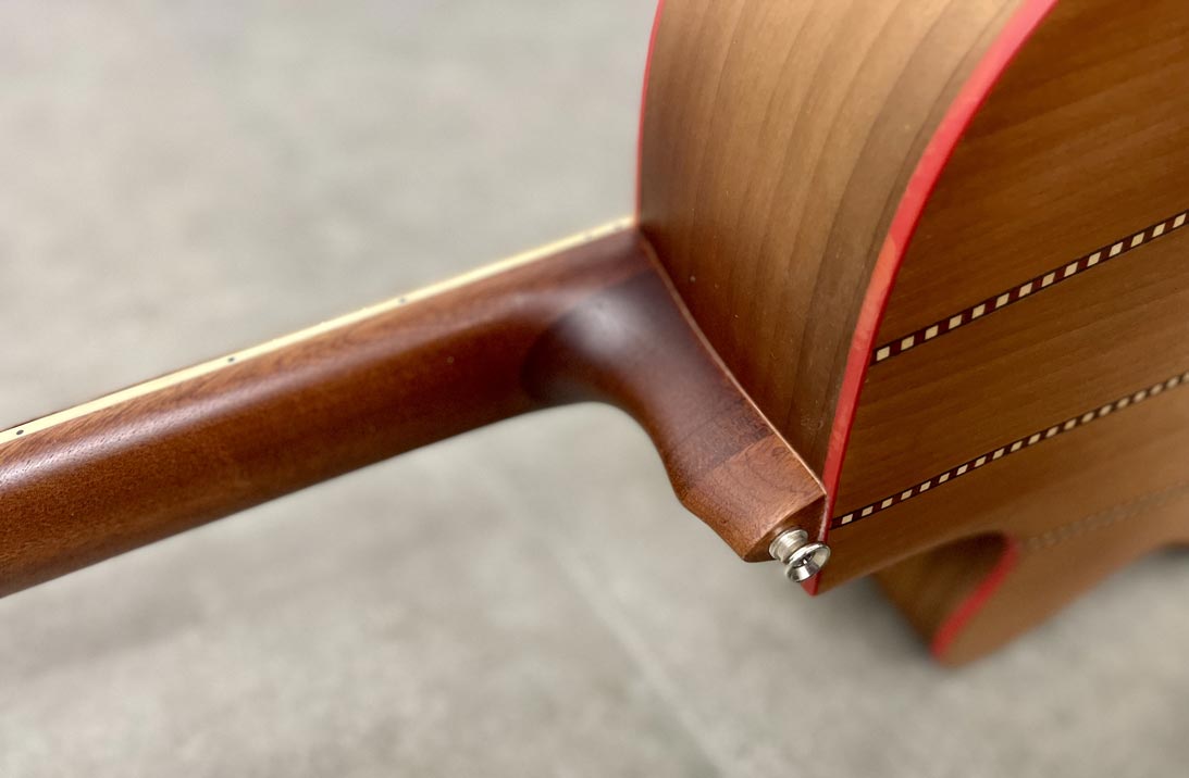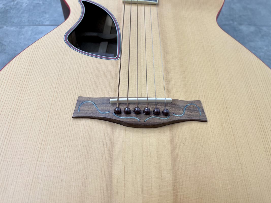 Fondo fasce in granadillo messicano Tavola in abete Manico in padouk 3 strati Tastiera in pauferro Ponte e traversino in osso Tasti medium jumbo Diapason 650 mm Intarsio abalone madreperla Rosetta in padouk Cassa armonica 10 mm al collo 12 mm al tacco Verniciatura satinata Braccing a X mod. d28